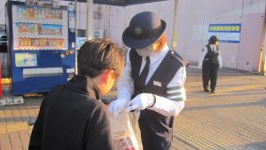 西都地区で交通安全活動をしている「西都市交通安全担当者」「西都市交通安全指導員」「西都警察署のおまわりさん」私たち「西都地区交通安全協会の職員」総ぐるみで啓発チラシやグッズを配付し、交通安全を呼びかけました。