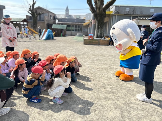 さつき保育園🚥 空に届きそうなほど大きく元気いっぱい手を挙げて横断する園児さんでした。 ぼんちくんとの対面でも静かにしっかり👀を見てきいてくれました。 頑張りましたね😊年長さん、小学校でも交通ルールをしっかり守って元気に過ごしてください💕