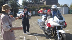 「やったー 白バイに乗れた!」 でも少し緊張・・・ 白バイのおまわりさん かっこいいなー! 先生も指導員も密かに思ってる