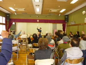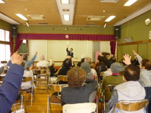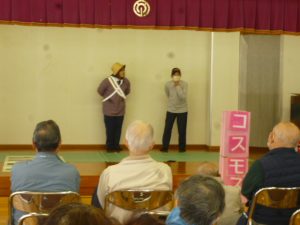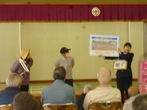 久々の寸劇やってきました 寸劇は「おじいさんの斜め横断」です。少し遠くても、道路にいる時間を短くして横断歩道を安全に道路を渡りましょう。 後出しジャンケンで「目で見て」「判断して」「行動する」運転機能の訓練を楽しく行いました。 久々の寸劇は大受けでした。次回お楽しみに!