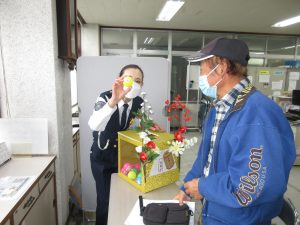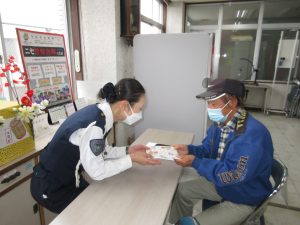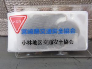 ちなみにお配りした粗品には宮崎県交通安全協会と小林地区交通安全協会の連名の