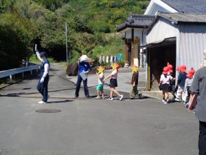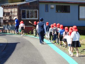 狭い道では一列に歩き、脇道がある場所でも左右を確認し、安全に歩くことができました。
