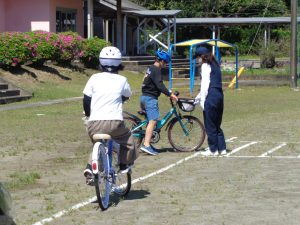 運動場で自転車の点検と、コースを作って安全な自転車の乗り方を練習しました。