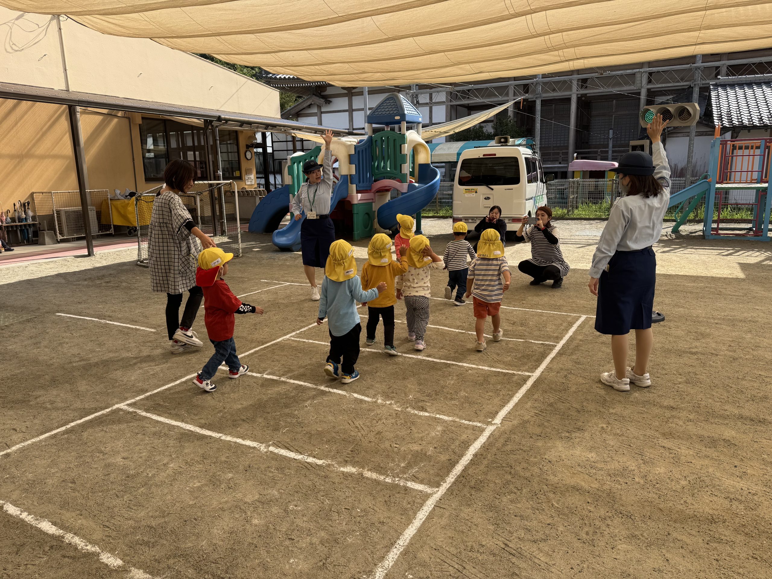 室内で信ちゃんと交通安全のお話をしたり、園庭で横断歩道の渡り方を練習しました。