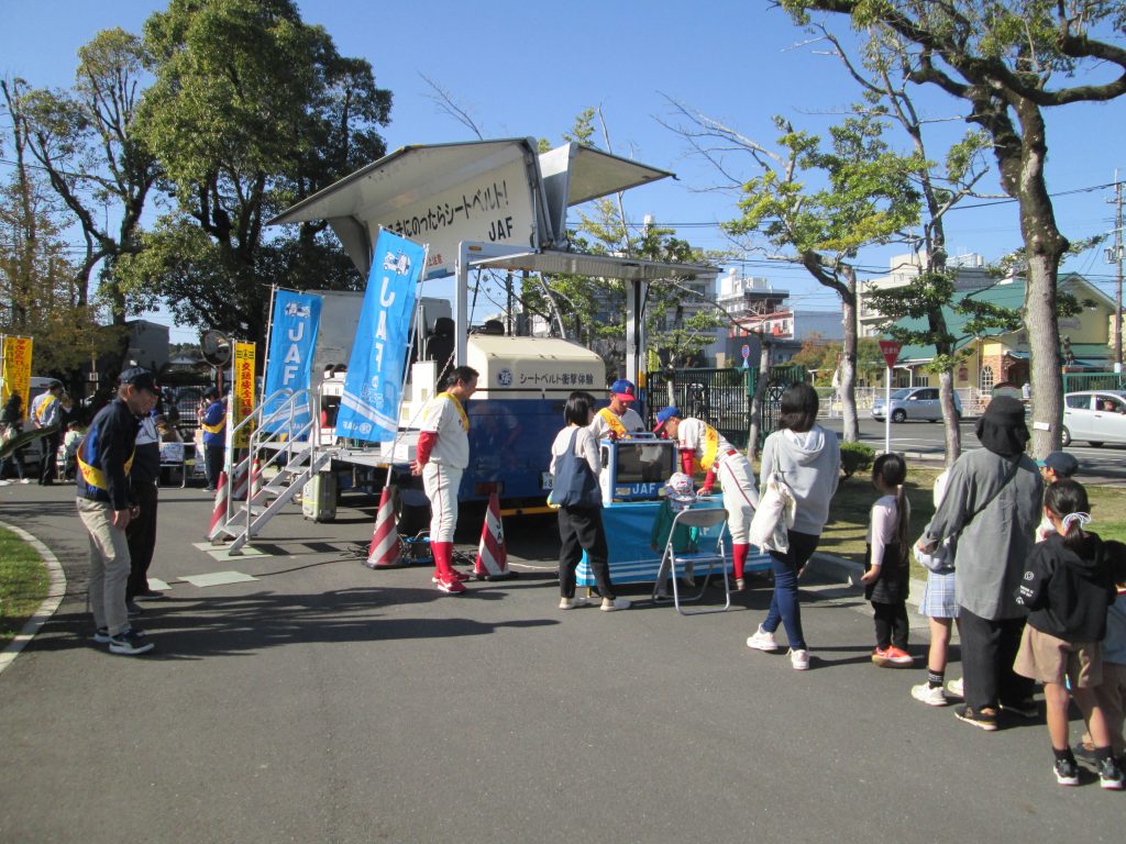 キャンペーンでは、宮崎県警察本部のセーフティフェニックス号による運転シミュレータ体験、JAFの「シートベルトコンピンサー」による事故衝撃体験やこども免許証の作成コーナー、あいおいニッセイ同和損保の反射材作成教室などを行いました。