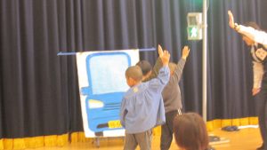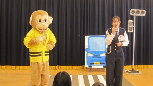 今日は〝さる吉くん〟と一緒に交通安全のお勉強しようね元気よく「はーい」と子供たち