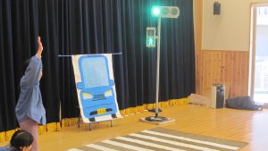 交通教室が始まると真剣そのもの!今日は横断歩道の渡り方です。お姉さんのお話しにもしっかり耳を傾けてくれ、実技では「右よーし 左よーし 右よーし 信号よーし」の声が山間にこだましました。