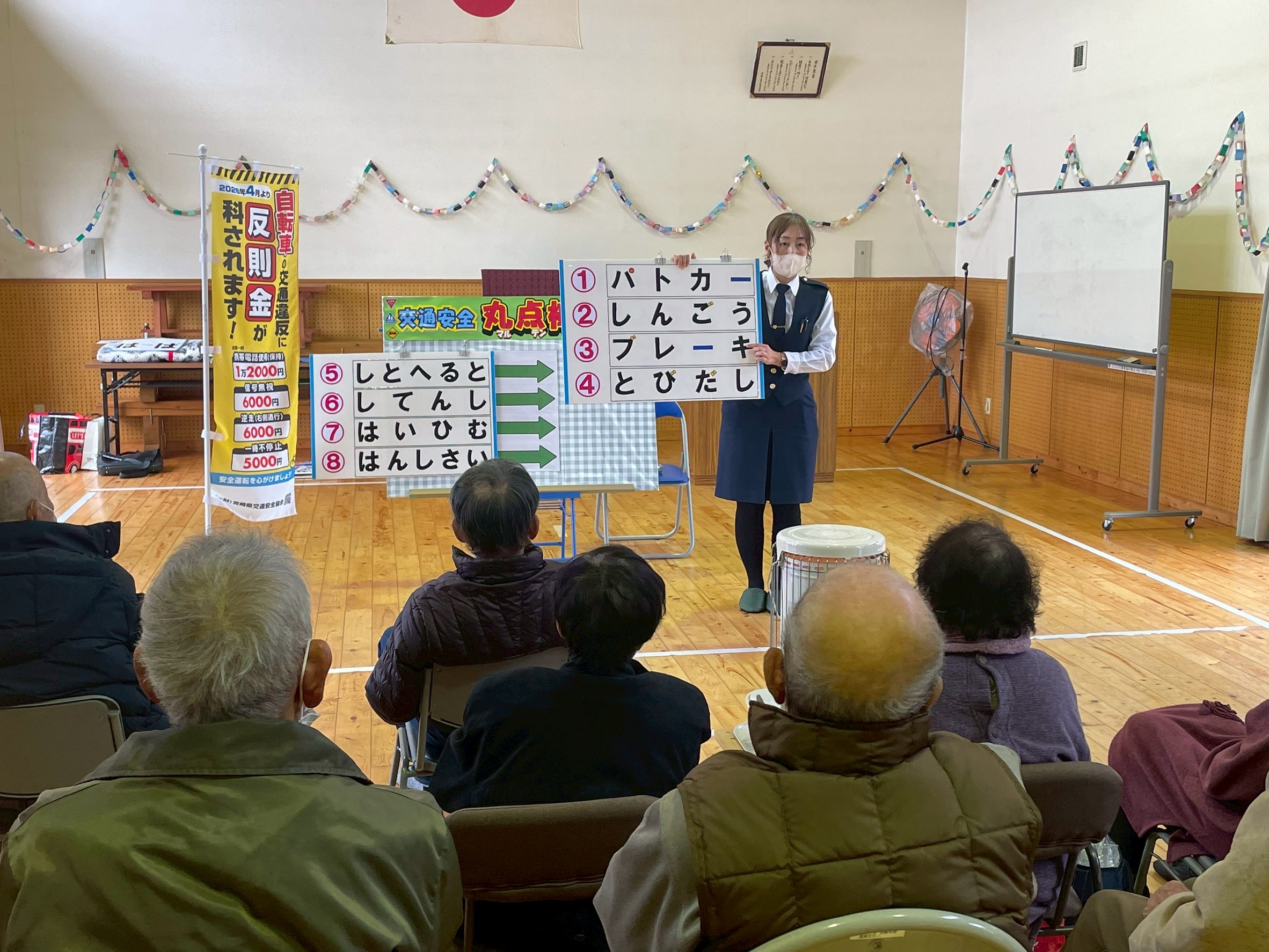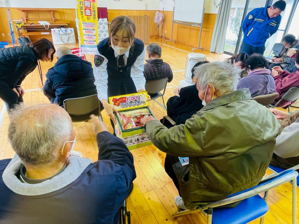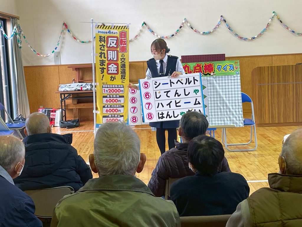 安全・安心講座(東川北自治会) 令和8年2月6日(金) 東川北自治会の高齢者を対象とした交通教室を実施しました。 音楽にあわせて体操・『交通安全クイズ』をしました。 最後に、おみくじ付き反射キーホルダーを配布し、とても喜ばれました。