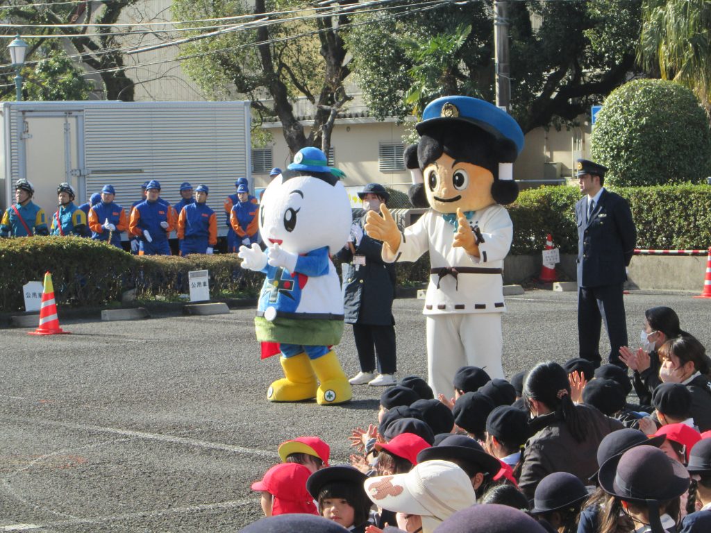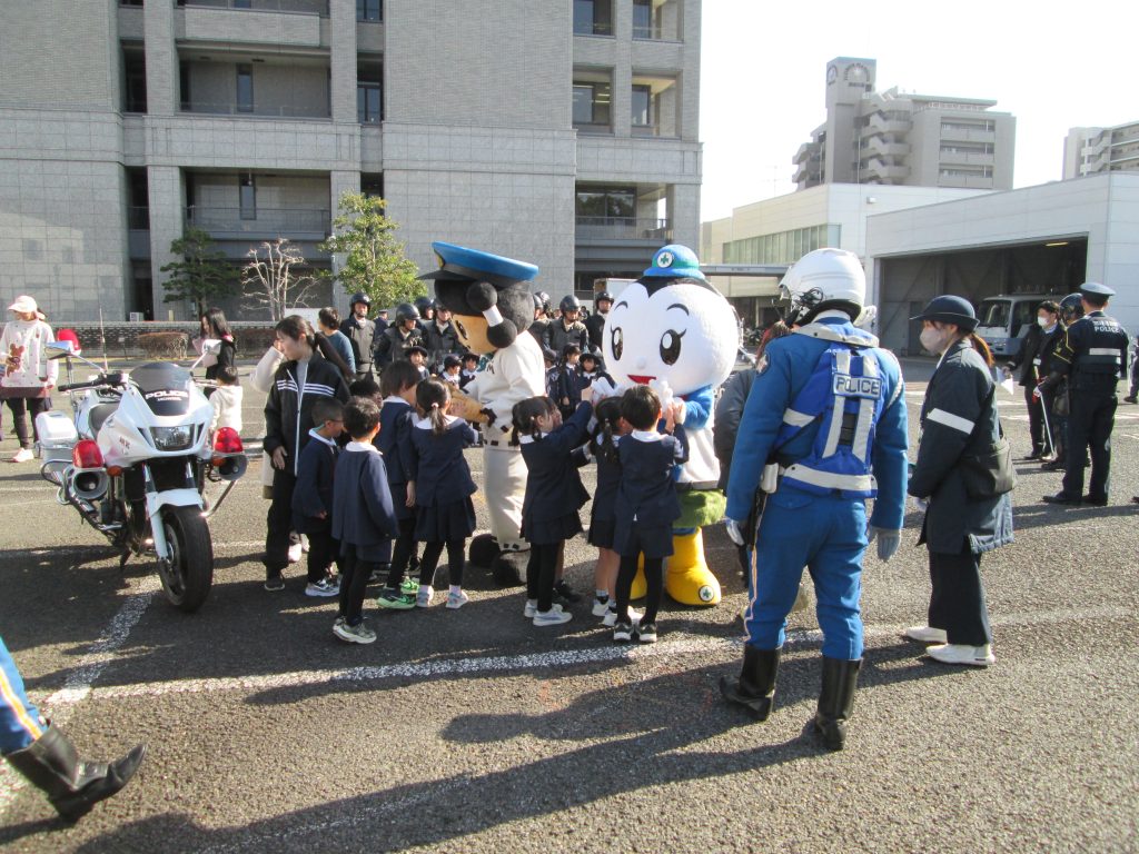 とてもたくさんの幼稚園の園児が見に来ていましたので、警察の「みやけいちゃん」と交通安全協会の「まもりん」と 一緒に写真撮影などをしました。