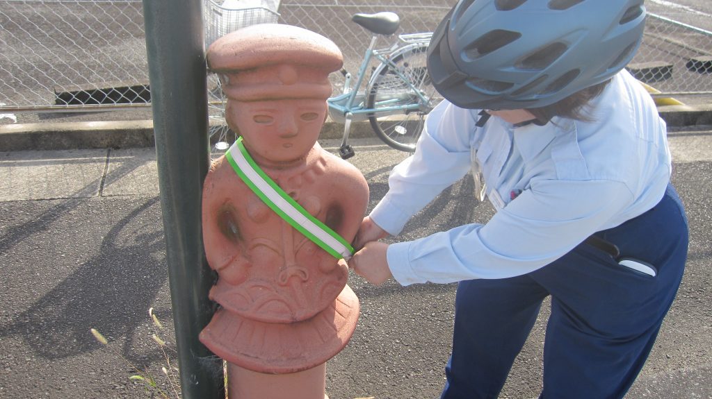 11/1から始まる『夕暮れ時の早めの点灯・ピカピカ運動』に向けて巨大埴輪モニュメント4基、街灯埴輪モニュメント59基に反射タスキを取り付けました。