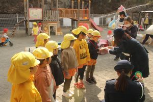 2月24日(火)日之影町 しいの実保育園の幼児交通教室をおこないました。保育園を出発し、近くの信号のある横断歩道まで歩いていきました。途中、カーブミラーを見ないといけない場面があり、車がきていないかの確認もできていました。横断歩道を渡る時も、大きな声でしっかり確認しながら渡ることができました。最後に警察官からのお話をしていただき、年長組さんに手作りプレゼント🎁をお渡ししました。