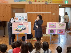 幼児交通教室 サティこども園 令和8年3月4日(水) 今日は宮崎市清武町にあるサティこども園で交通安全教室を行いました。 色々な車の音あてクイズでは、車の音を聞いてどの車の音かをみんなで当てて、大きな車のパズルを作ったり、 横断歩道の渡り方を一緒にお勉強しました。 子どもたちも元気よく参加してくれました。 最後にお約束カードとまもりんのシールを園児にプレゼントしました。