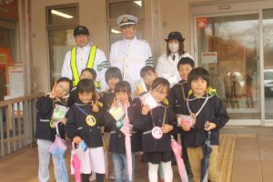 2月27日(金)五ヶ瀬町 五ヶ瀬中央保育所の幼児交通教室をおこないました。あいにくの雨でしたが、年長組さんは傘をさしての練習となりました。歩いて10分ほどかかる信号機のある横断歩道では大きな声でしっかり確認をして渡ることができました😊。最後に警察官からのお話をしていただき、手作りプレゼント🎁をお渡ししました。