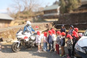 2月19日(木)高千穂町 旭ヶ丘保育園の幼児交通教室をおこないました。保育園近くの信号機のある横断歩道を、ドキドキしながら大きな声で確認して渡ることができました。手作りプレゼント🎁を渡したあと、最後に警察官からお話をしていただき、パトカーと白バイの🚔🚨見学をさせていただきました😊