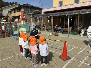 園庭にコースを作り、信号機のある横断歩道では、信号のお約束と横断歩道の渡り方を・・・