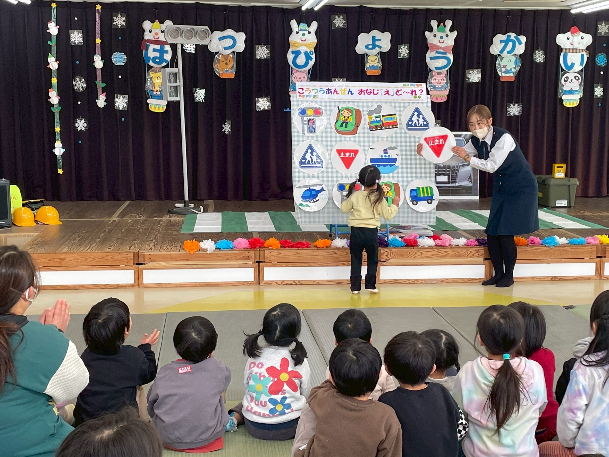 交通安全ゲームをして、チャイルドシートや標識について学び、信号機のある横断歩道の渡り方をしました。