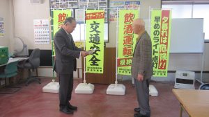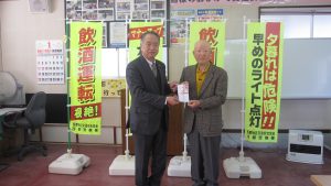 西都地区安全運転管理者等協議会長から西都地区交通安全協会長へ 支援して頂いた皆様の気持ちを胸に贈呈