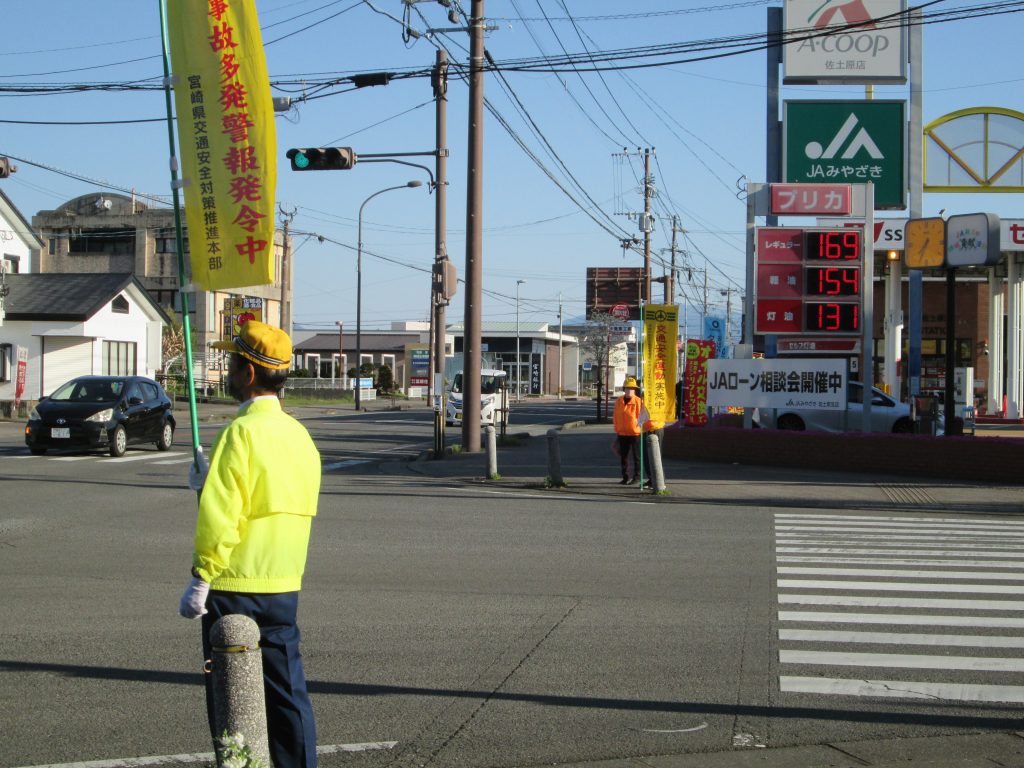4月8日、佐土原駅前交差点で「春の全国交通安全運動」のキャンペーンを行いました。