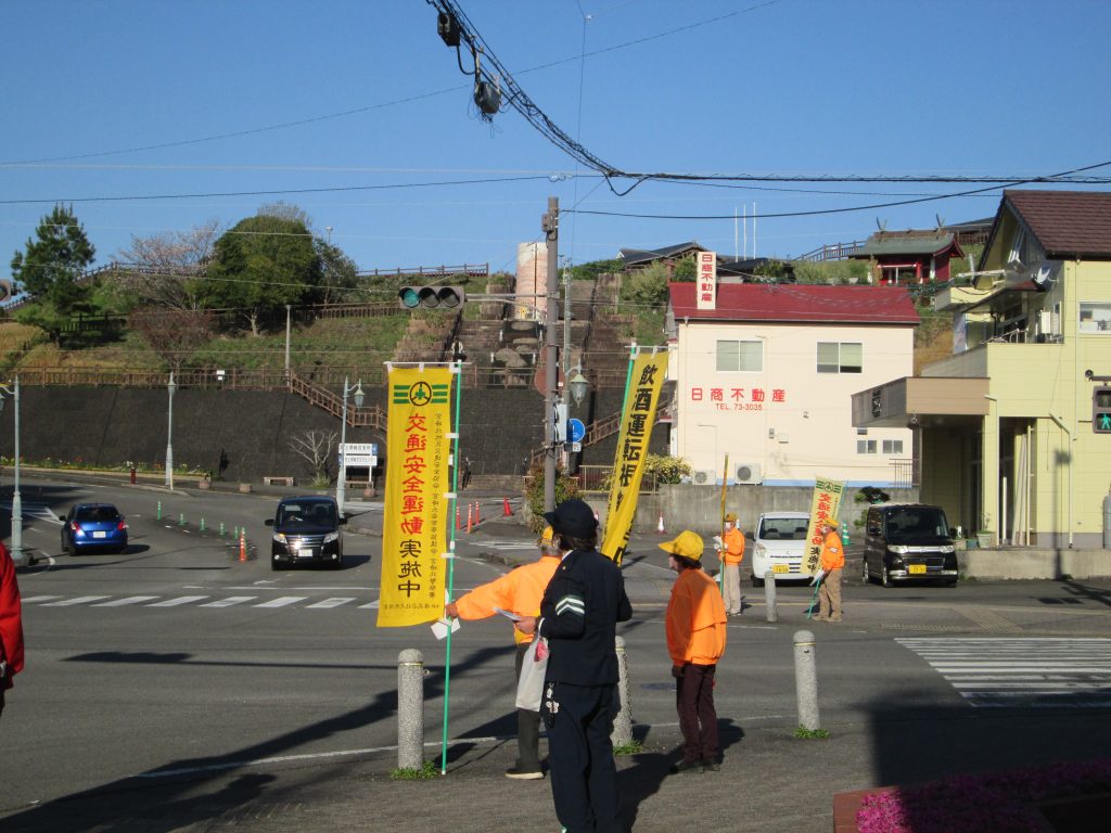 4月8日、佐土原駅前交差点で「春の全国交通安全運動」のキャンペーンを行いました。