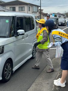 チラシとお茶を配布し、ながらスマホ等防止等を呼びかけました。