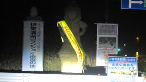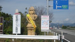 「巨大埴輪モニュメント」の昼の姿です。昼間も「早めの点灯・ピカピカ運動」を呼びかけています。