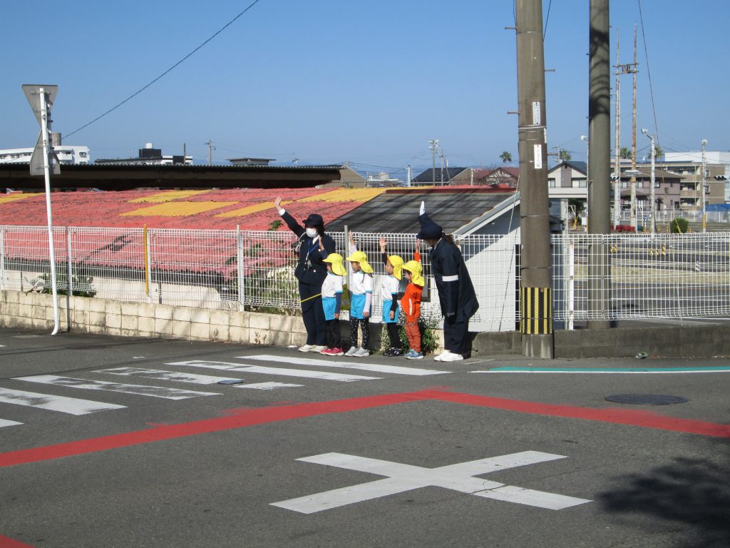 11月26日、宮崎市内の保育園で、周辺の道路での歩き方や横断歩道の渡り方などの実演指導を行いました。