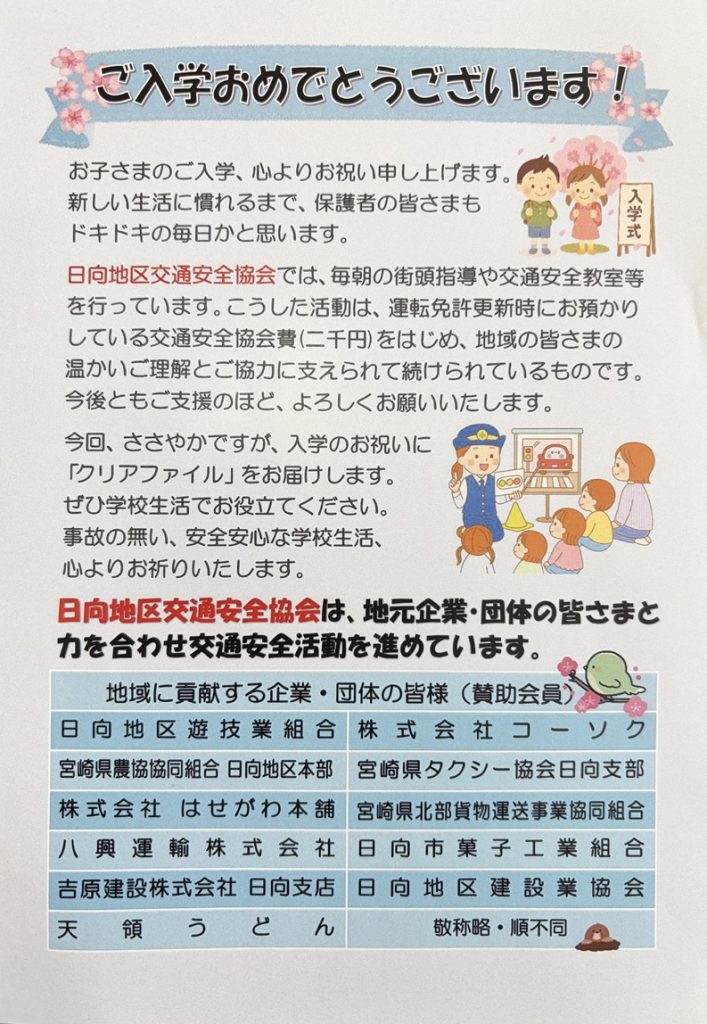 入学後も日向地区交通安全協会は、地域の皆さまと力を合わせながら、子どもたちの安全をしっかりと見守ってまいります。