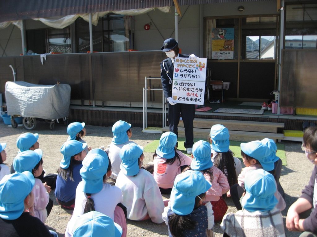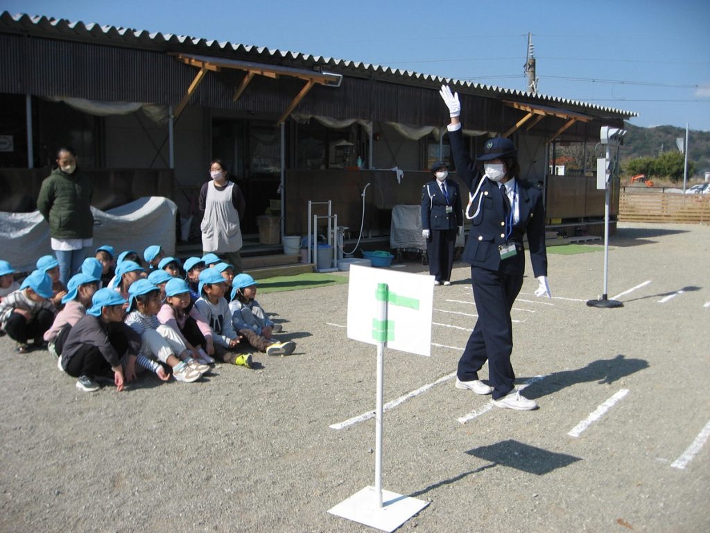 今日は、ぽかぽかと暖かいお天気の中、財光寺保育園で交通安全教室を行いました