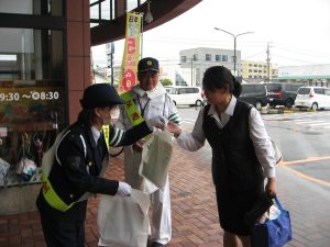 4月14日(火)、門川町のサンシールさの店舗前にて、門川町役場・交通安全協会門川支部・門川交番の警察官のみなさまと一緒に、春の全国交通安全運動にともなう街頭キャンペーンを実施しました🌸