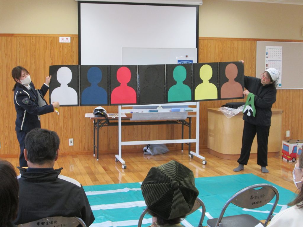 宮崎北警察署交通課の方と一緒に、高齢者の方が交通事故に遭わないように道路を横断する時の注意事項や反射材の活用方法、夜間の明るい服装の着用などについて説明をしました。