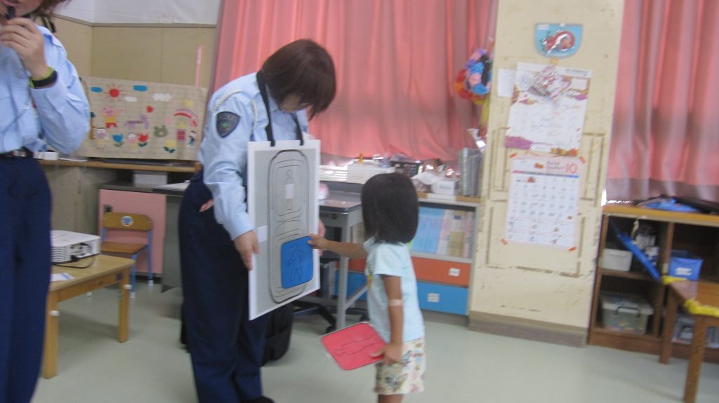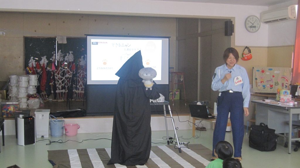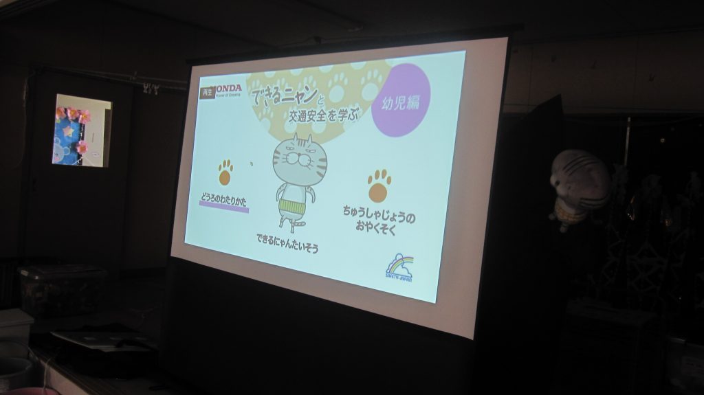 本田技研工業(株)から提供を受けた交通安全教材『できるにゃんパペットと DVD』を使って、2回目の交通安全教室(できるニャンとどうろのわたりかた)を行いました💕