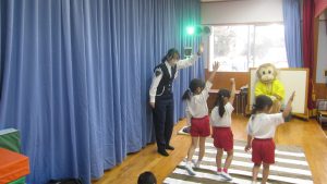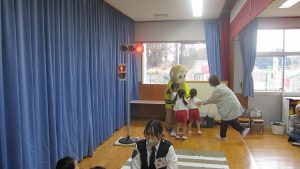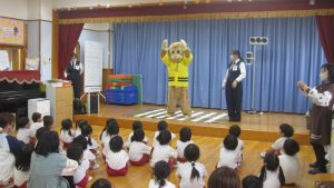 いよいよ 卒園シーズンが近づいてきました。この時期 西都市内にある 稚児ヶ池保育園 でも交通安全教室を行います。特に年長さんは卒園すると親御さんなどの手を離れ、小学1年生となって一人歩きする機会が増えてきます。自立する第一歩 交通事故に遇わないように、自分の命は自分で守れるように 基本である信号機の意味・見方・横断方法を再度学んでもらいました。そこで、〝さる吉くん登場〟子供たちを応援します。
