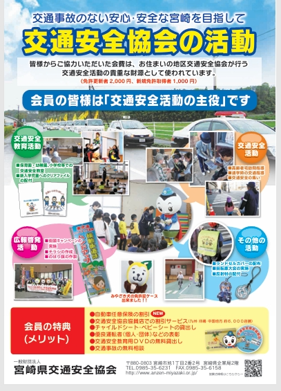 - 宮崎・都城・延岡の免許センター及び皆様方がお住まいの地区交通安全協会で入会できます。