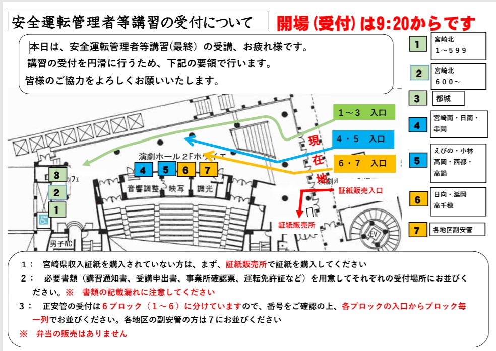 2 留意事項 ○最終講習の会場である宮崎県立芸術劇場(演劇ホール)の開場(受付)は午前9時20分となります。 ○当日の弁当の販売はありません。 ○講習当日は各地区から多数の受講者が来ることが予想されます。 講習手数料(宮崎県収入証紙5,100円)については、あらかじめ各地区交通安全協会等の証紙売りさばき所で購入をお願いします。 ○当日の各地区の受付場所は下図のとおりです。